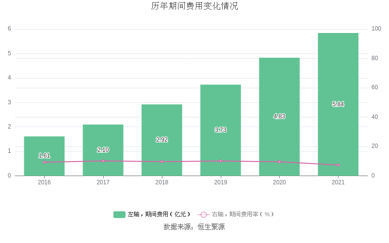 2021年全年,公司期间费用为5.84亿元,较上年增加1.00亿元;但期间费用率为7.36%,较上年下降2.21个百分点。