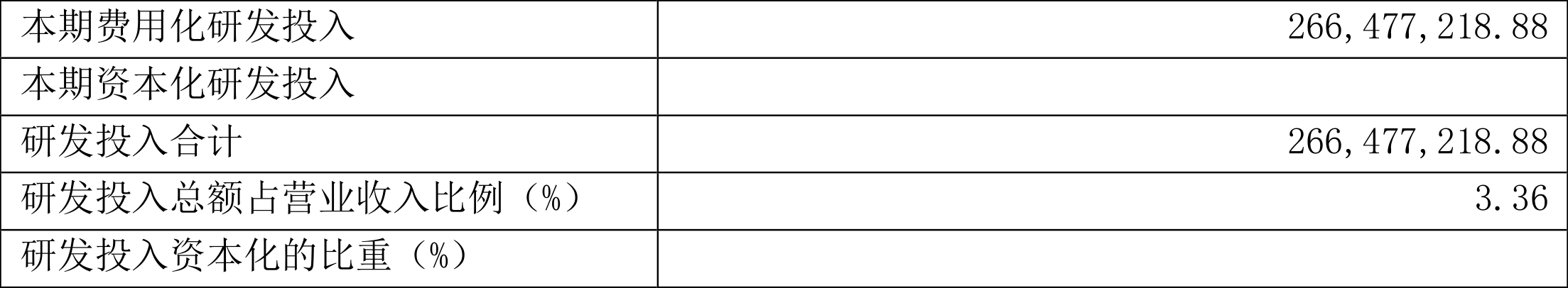 2021年全年,公司研发投入金额为2.66亿元,同比增长42.22%;研发投入占营业收入比例为3.36%,相比上年同期下降0.35个百分点。此外,公司全年研发投入资本化率为0。
