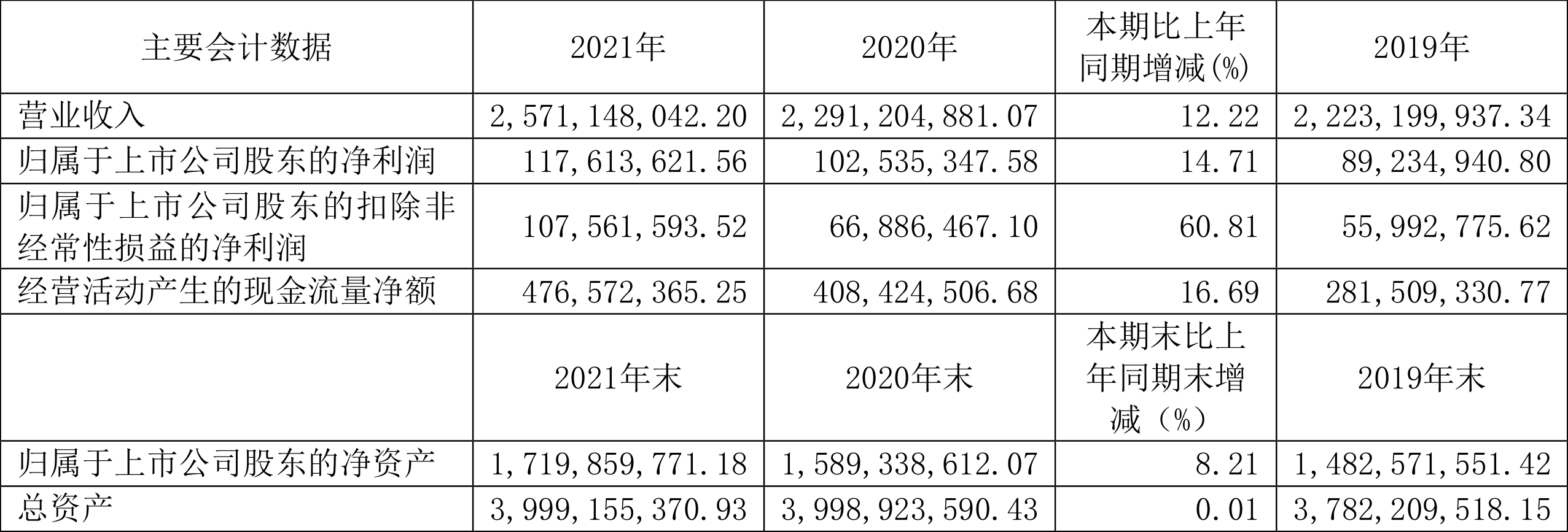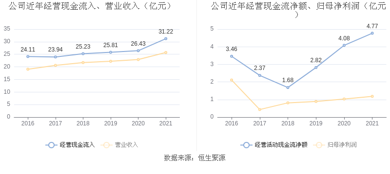 截至2021年末,公司经营活动现金流净额为4.77亿元,同比增长16.69%;筹资活动现金流净额-2.00亿元,同比减少1.35亿元;投资活动现金流净额-3.10亿元,相比上年同期增加2476.29万元。