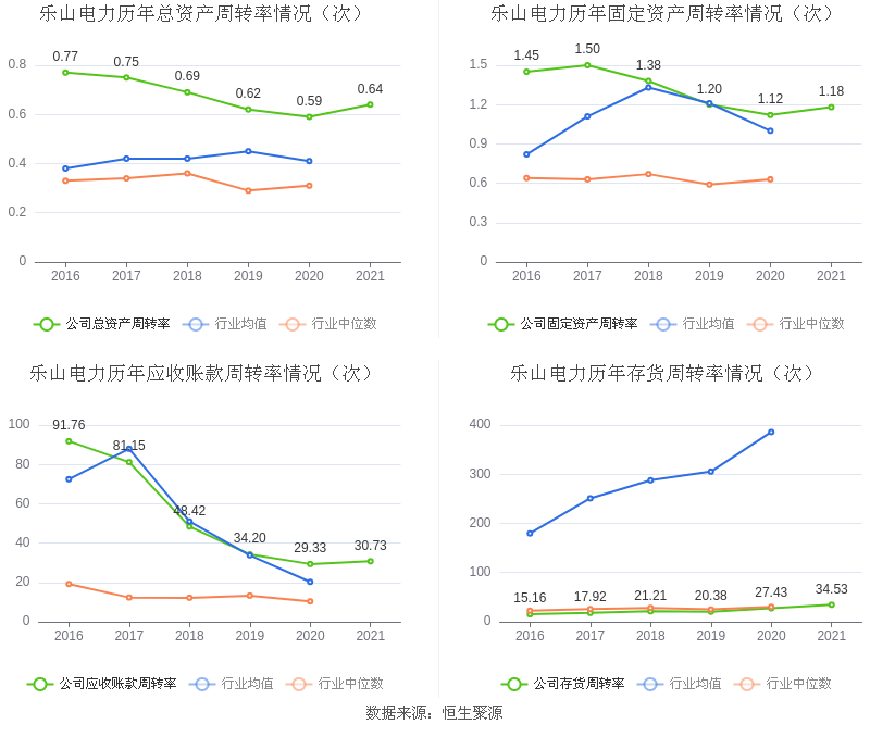 营运能力方面,2021年,公司总资产周转率为0.64次,上年同期为0.59次(2020年行业平均值为0.41次,公司位居同行业3/14);固定资产周转率为1.18次,上年同期为1.12次(2020年行业平均值为1.00次,公司位居同行业3/14);公司应收账款周转率、存货周转率分别30.73次、34.53次。