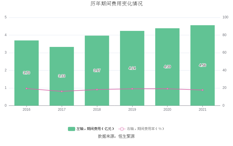 2021年全年,公司期间费用为4.56亿元,较上年增加1656.88万元;但期间费用率为17.72%,较上年下降1.44个百分点。