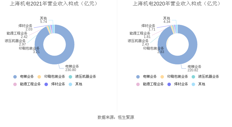 分产品来看,2021年度公司主营业务中,电梯业务收入230.80亿元,占营业收入的93.38%,同比增长4.52%;印刷包装业务收入3.21亿元,占营业收入的1.30%,同比增长13.55%;液压机器业务收入2.97亿元,占营业收入的1.20%,同比增长21.86%。