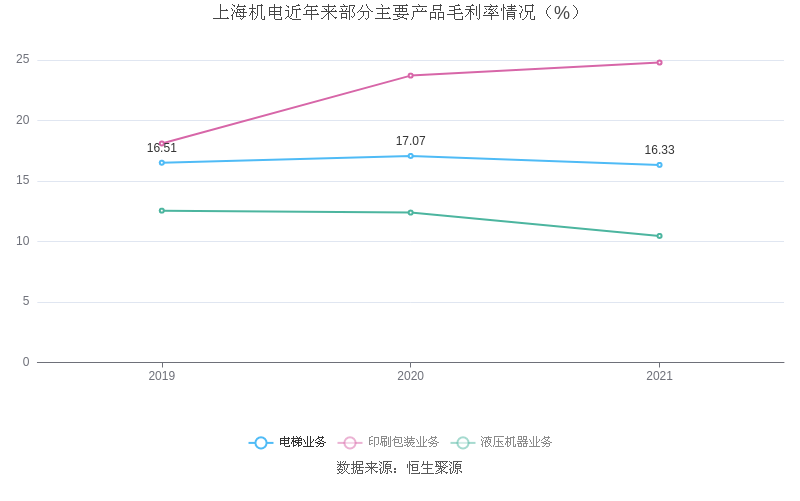 分产品看,电梯业务、印刷包装业务、液压机器业务2021年毛利率分别为16.33%、24.79%、10.46%。