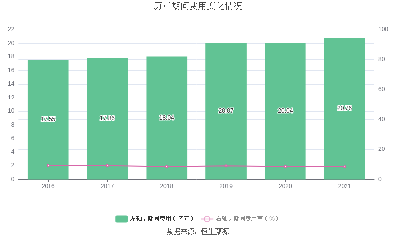 2021年全年,公司期间费用为20.76亿元,较上年增加7149.53万元;但期间费用率为8.40%,较上年下降0.17个百分点。