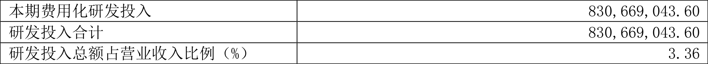 2021年全年,公司研发投入金额为8.31亿元,同比增长5.13%;研发投入占营业收入比例为3.36%,相比上年同期下降0.02个百分点。此外,公司全年研发投入资本化率为0。