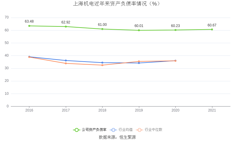 在偿债能力方面,公司2021年末资产负债率为60.67%,相比上年同期上升0.44个百分点,近年来整体高于行业均值。