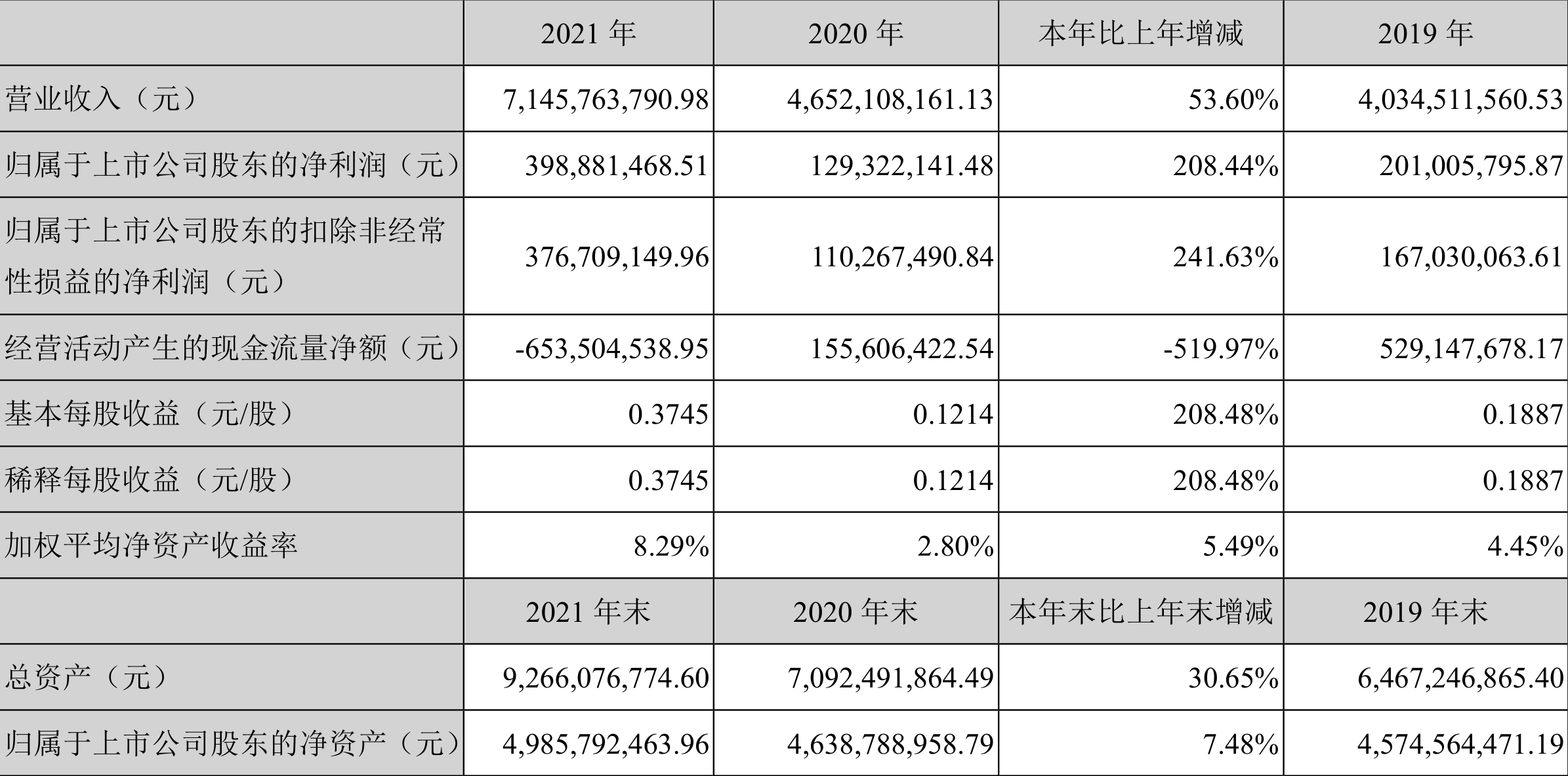 中证财讯 中科三环(000970)3月26日披露2021年年度报告。2021年,公司实现营业收入71.46亿元,同比增长53.60%;归母净利润3.99亿元,同比增长208.44%;扣非净利润3.77亿元,同比增长241.63%;经营活动产生的现金流量净额为-6.54亿元,上年同期为1.56亿元;报告期内,中科三环基本每股收益为0.37元,加权平均净资产收益率为8.29%。拟向全体股东每10股派0.80元(含税)。
