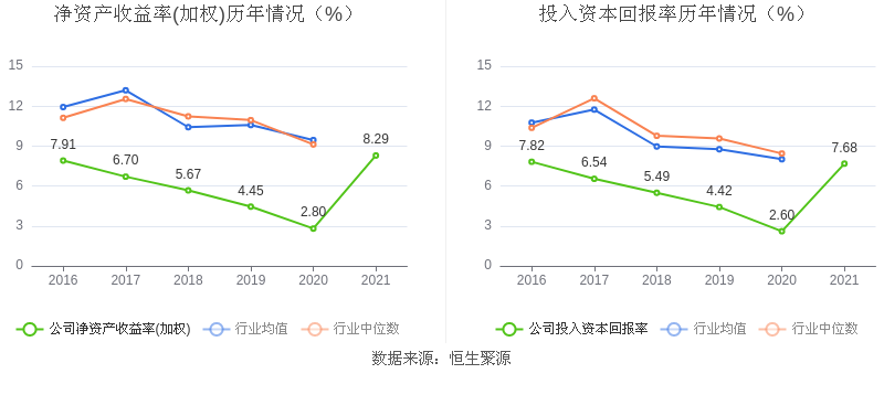 数据显示,2021年公司加权平均净资产收益率为8.29%,较上年同期增长5.49个百分点,长期低于行业平均;公司2021年投入资本回报率为7.68%,较上年同期增长5.08个百分点。
