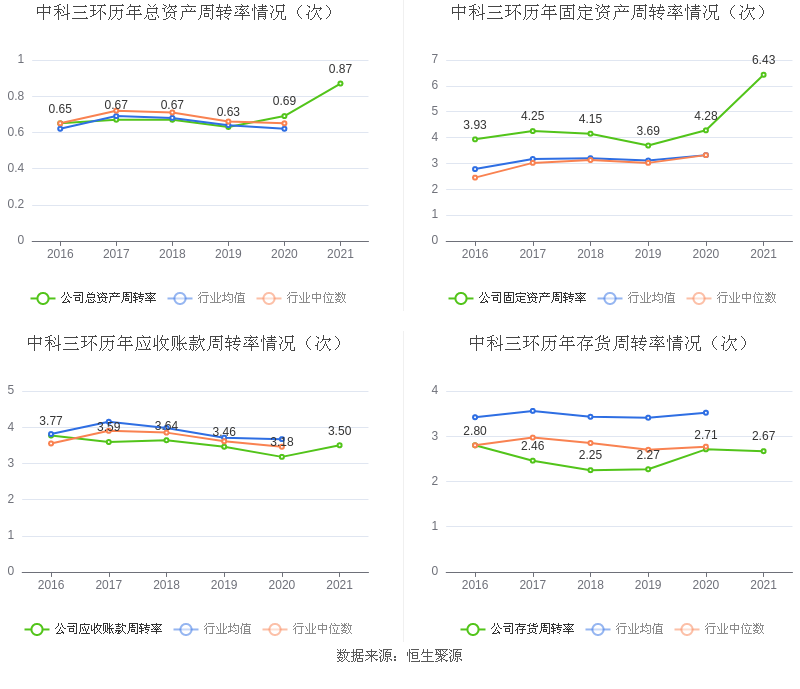 营运能力方面,2021年,公司总资产周转率为0.87次,上年同期为0.69次(2020年行业平均值为0.62次,公司位居同行业5/12);固定资产周转率为6.43次,上年同期为4.28次(2020年行业平均值为3.32次,公司位居同行业2/12);公司应收账款周转率、存货周转率分别3.50次、2.67次。