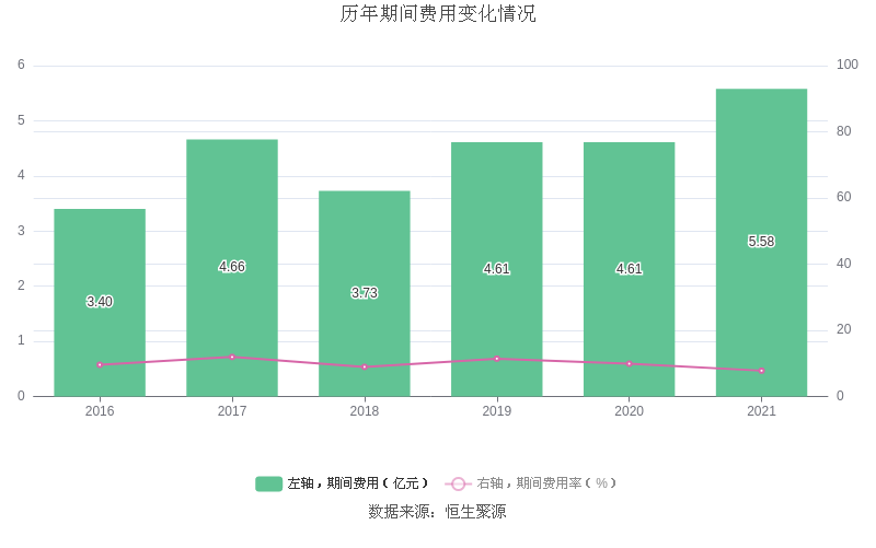 2021年全年,公司期间费用为5.58亿元,较上年增加9678.18万元;但期间费用率为7.81%,较上年下降2.10个百分点。