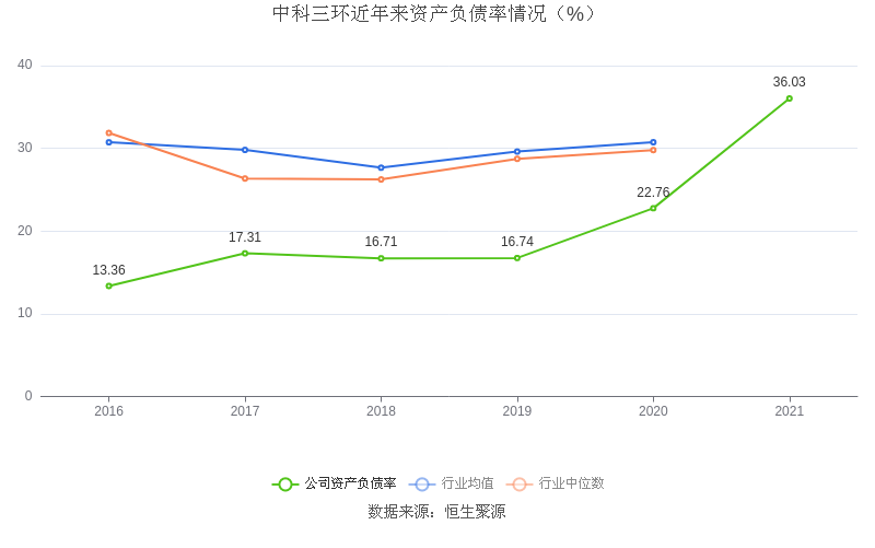 在偿债能力方面,公司2021年末资产负债率为36.03%,相比上年同期上升13.27个百分点,近年来整体低于行业均值。
