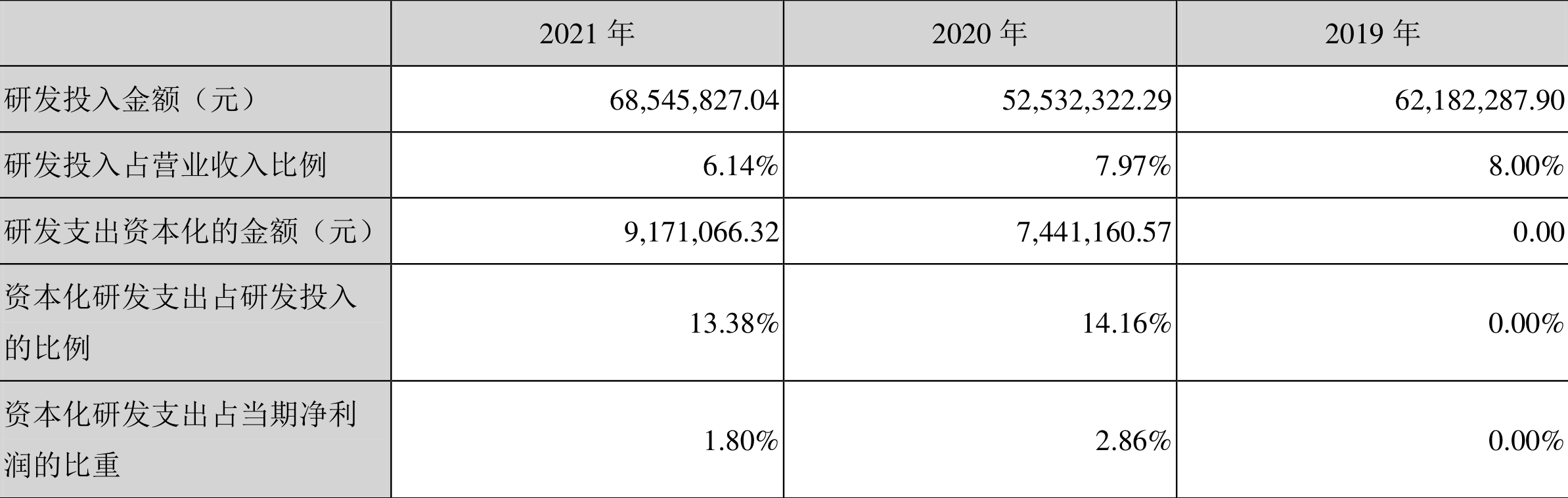 2021年全年,公司研发投入金额为6854.58万元,同比增长30.48%;研发投入占营业收入比例为6.14%,相比上年同期下降1.83个百分点。此外,公司全年研发投入资本化率为13.38%。