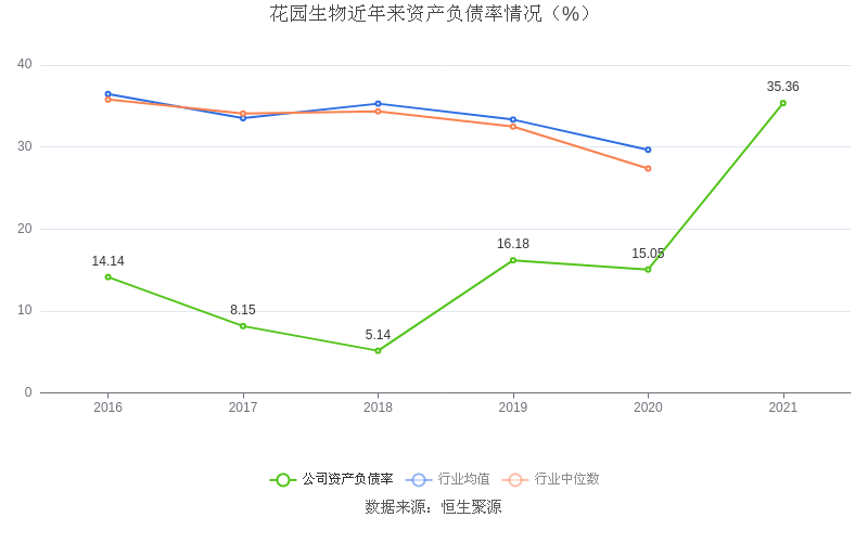 在偿债能力方面,公司2021年末资产负债率为35.36%,相比上年同期上升20.31个百分点,近年来整体低于行业均值。