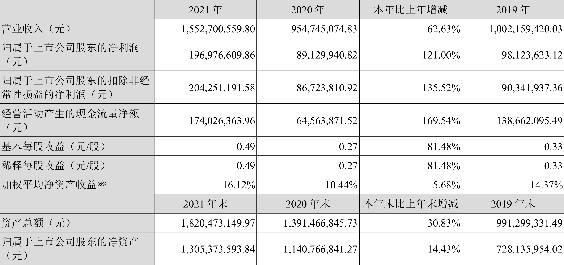 在资产重大变化方面,2021年末,公司货币资金余额较期初增加15.56%,主要系上期首次公开发行股票募集资金所致;应收账款较期初增加56.16%,主要系本期销售收入增长,期末未到结算期的应收账款增加所致;预付款项较期初增加36.29%;存货较期初增加56.80%,主要系本期末原材料价格及库存商品单位成本上升所致。