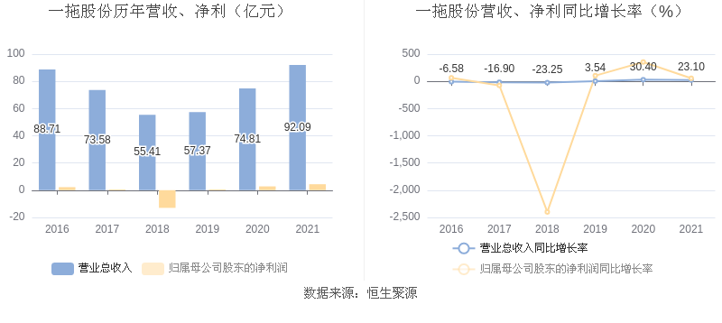 中证财讯 一拖股份(601038)3月30日披露2021年年度报告。2021年,公司实现营业收入92.09亿元,同比增长23.10%;归母净利润4.38亿元,同比增长56.42%;扣非净利润3.35亿元,同比增长129.56%;经营活动产生的现金流量净额为5.82亿元,同比下降53.37%;基本每股收益为0.39元,加权平均净资产收益率为8.49%。拟向全体股东每10股派发现金红利1.17元(含税)。