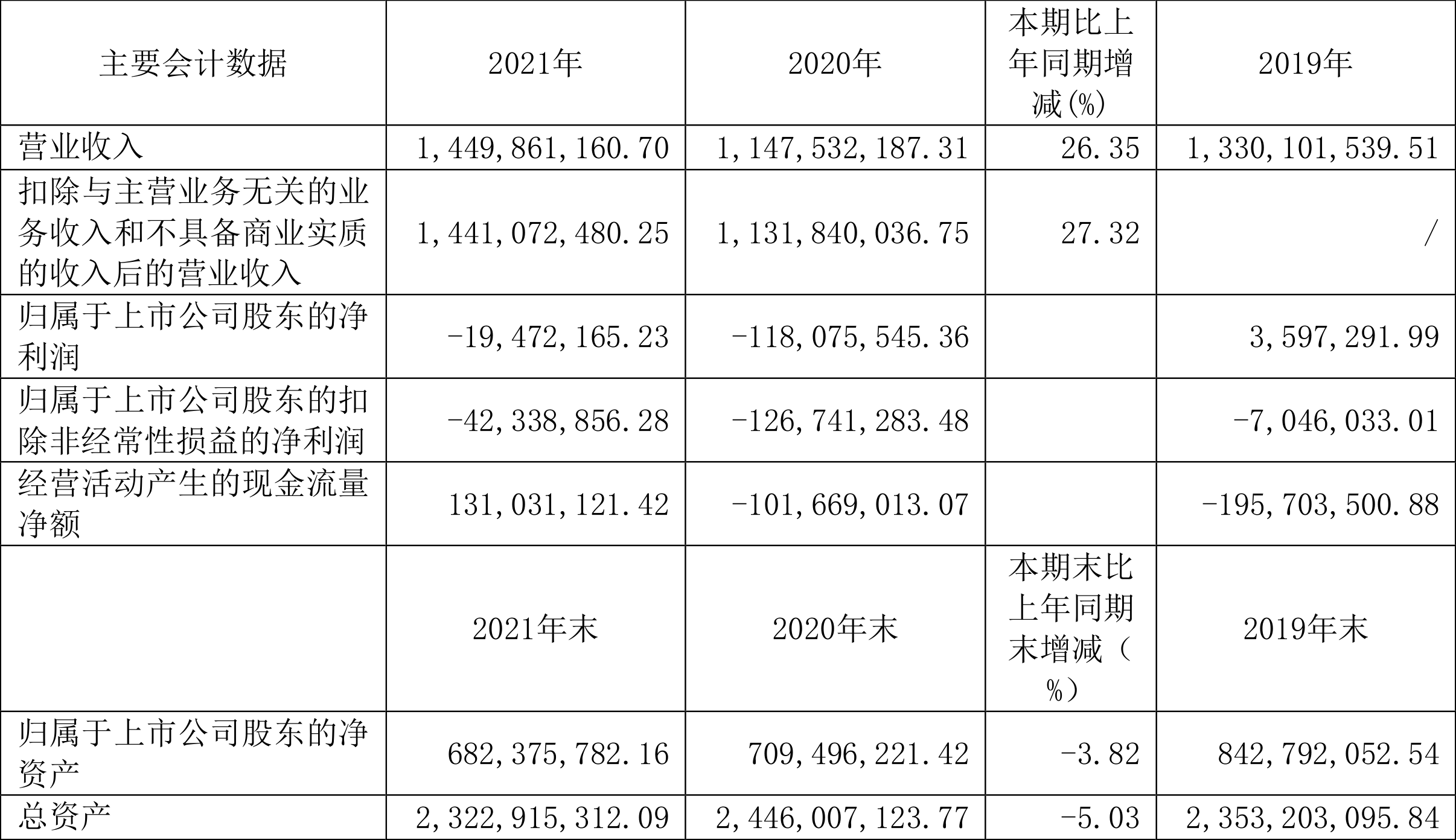 中证财讯 国投中鲁(600962)3月31日披露2021年年度报告。2021年,公司实现营业收入14.50亿元,同比增长26.35%;归母净利润亏损1947.22万元,上年同期亏损1.18亿元;扣非净利润亏损4233.89万元,上年同期亏损1.27亿元;经营活动产生的现金流量净额为1.31亿元,上年同期为-1.02亿元;基本每股收益为-0.07元,加权平均净资产收益率为-2.80%。