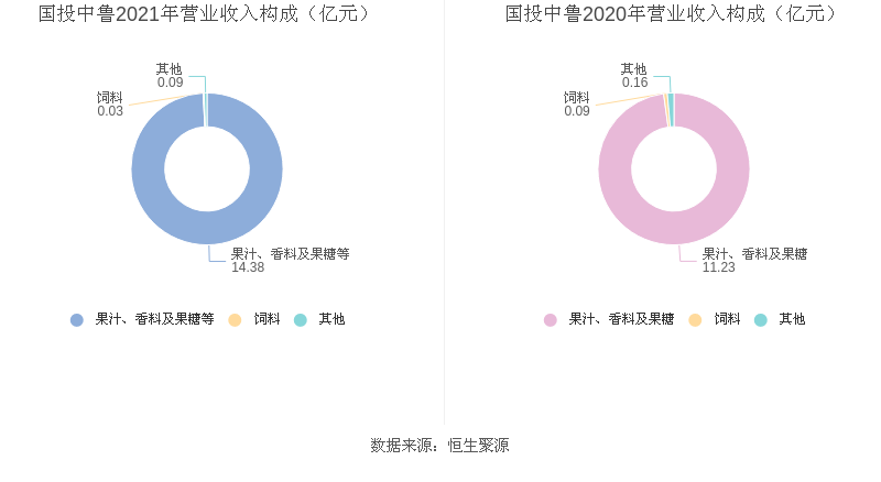 2021年度公司主营业务中,果汁、香料及果糖等收入14.38亿元,占营业收入的99.19%;其他业务收入0.09亿元,占营业收入的0.61%,同比下降43.99%;饲料收入0.03亿元,占营业收入的0.20%,同比下降67.52%。