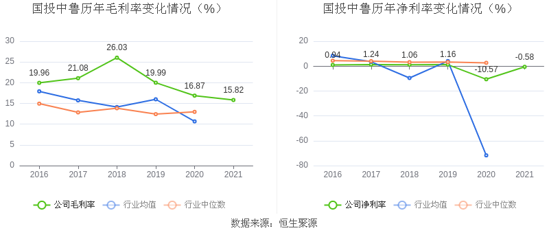 2021年,公司毛利率为15.82%,同比下降1.05个百分点;净利率为-0.58%,较上年同期上升9.99个百分点。