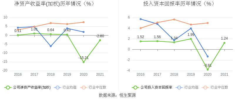数据显示,2021年公司加权平均净资产收益率为-2.80%,较上年同期增长12.41个百分点;公司2021年投入资本回报率为1.24%,较上年同期增长5.05个百分点。