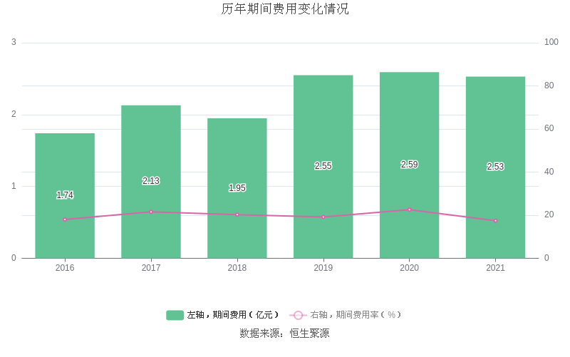2021年全年,公司期间费用为2.53亿元,较上年减少546.62万元;期间费用率为17.47%,较上年下降5.08个百分点。