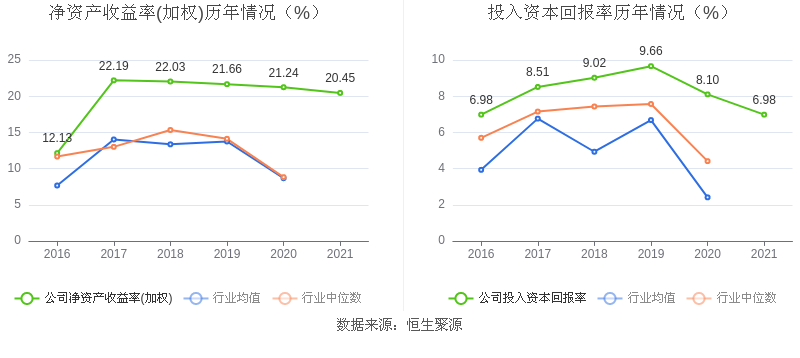 数据显示,2021年公司加权平均净资产收益率为20.45%,较上年同期下降0.79个百分点,已经是连续第四年下行,但,长期高于行业平均;公司2021年投入资本回报率为6.98%,较上年同期下降1.12个百分点。