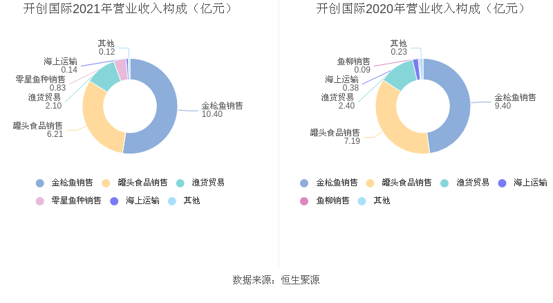 2021年度公司主营业务中,金枪鱼销售收入10.40亿元,占营业收入的52.50%,同比增长10.58%;罐头食品销售收入6.21亿元,占营业收入的31.37%,同比下降13.57%;渔货贸易收入2.10亿元,占营业收入的10.62%,同比下降12.27%。