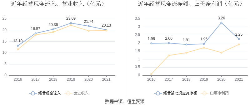 2021年,公司营业收入现金比为101.64%,净现比为117.64%。从近年数据来看,公司经营活动现金流入的增速与营业收入增速基本保持同步。
