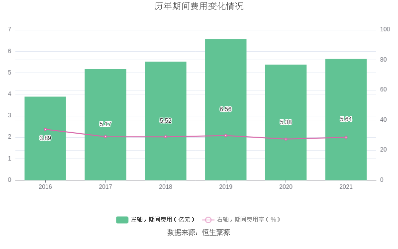 2021年全年,公司期间费用为5.64亿元,较上年增加2596.73万元;期间费用率为28.49%,较上年上升1.15个百分点。