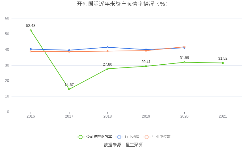 在偿债能力方面,公司2021年末资产负债率为31.52%,相比上年同期下降0.47个百分点,近年来整体低于行业均值。
