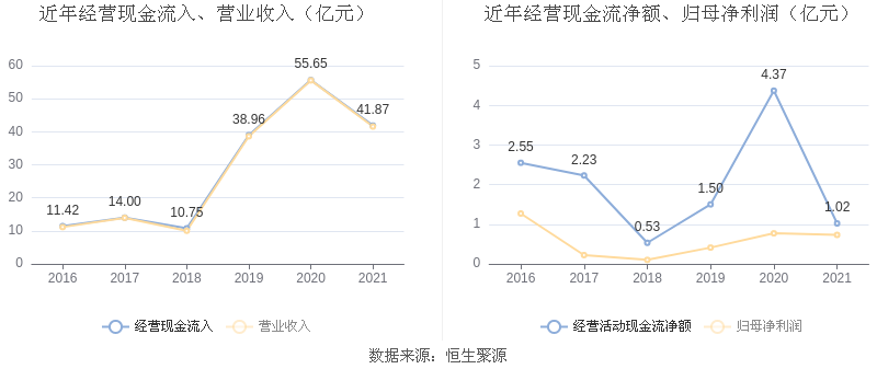 截至2021年末,公司经营活动现金流净额为1.02亿元,同比下降76.56%;筹资活动现金流净额-1810.65万元,同比减少495.36万元;投资活动现金流净额-1.40亿元,相比上年同期减少1875.72万元。