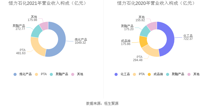 2021年度公司主营业务中,炼化产品收入1049.32亿元,占营业收入的53.00%;PTA收入481.63亿元,占营业收入的24.33%,同比增长63.56%;聚酯产品收入272.77亿元,占营业收入的13.78%,同比增长55.69%。