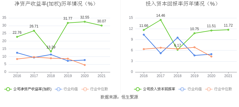 数据显示,2021年公司加权平均净资产收益率为30.07%,较上年同期下降2.48个百分点,长期高于行业平均;公司2021年投入资本回报率为11.72%,较上年同期增长0.21个百分点。