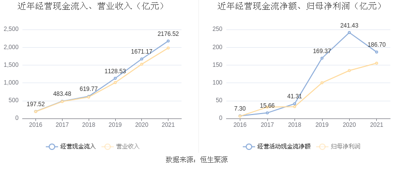 截至2021年末,公司经营活动现金流净额为186.70亿元,同比下降22.67%;筹资活动现金流净额-73.88亿元,同比减少63.67亿元;投资活动现金流净额-130.98亿元,相比上年同期增加93.13亿元。