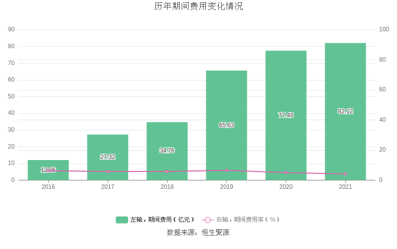 2021年全年,公司期间费用为82.12亿元,较上年增加4.65亿元;但期间费用率为4.15%,较上年下降0.93个百分点。