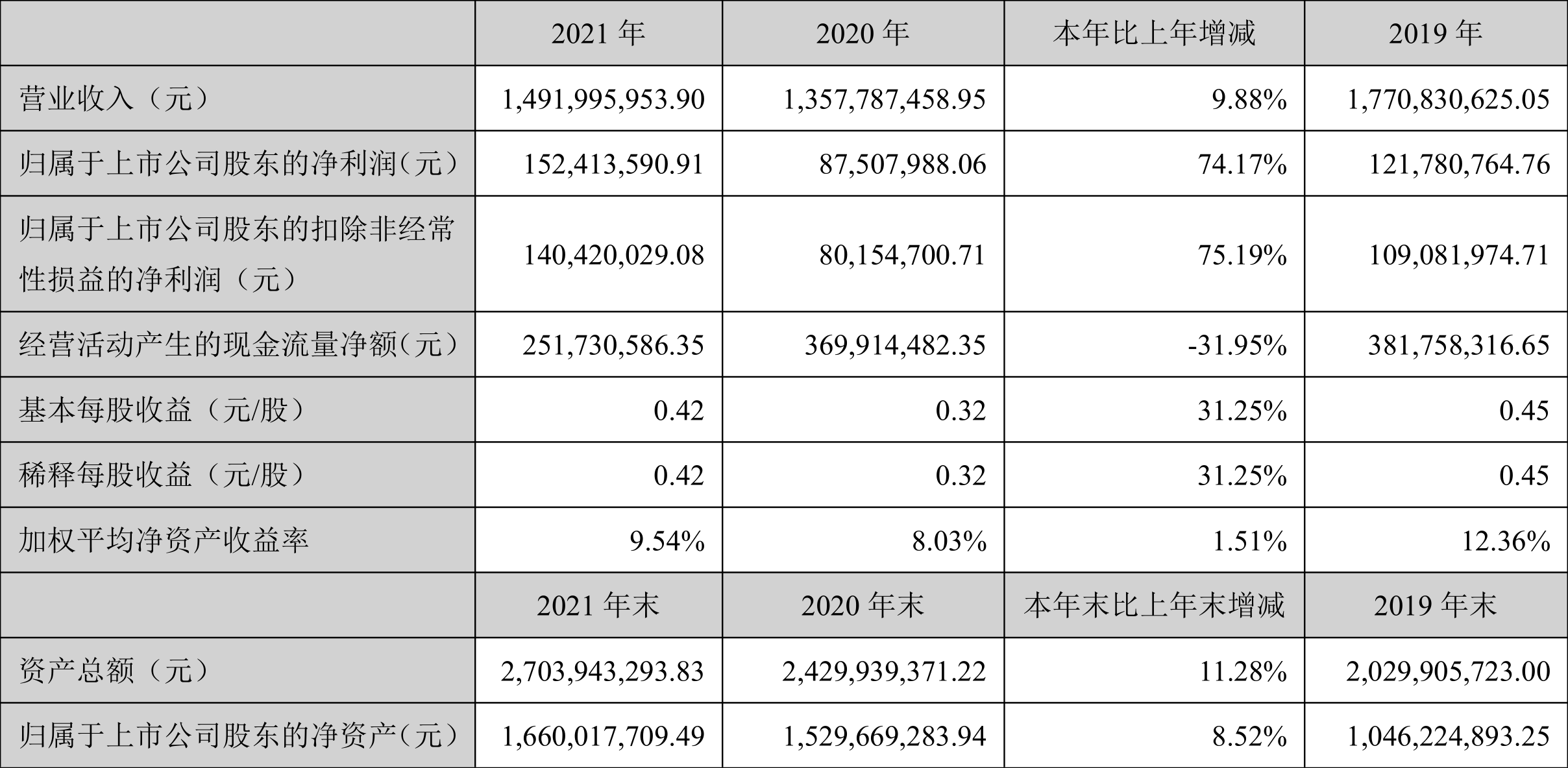 中证财讯 南山智尚(300918)4月8日披露2021年年度报告。2021年,公司实现营业收入14.92亿元,同比增长9.88%;归母净利润1.52亿元,同比增长74.17%;扣非净利润1.40亿元,同比增长75.19%;经营活动产生的现金流量净额为2.52亿元,同比下降31.95%;基本每股收益为0.42元,加权平均净资产收益率为9.54%。拟向全体股东每10股派1.26元(含税)。