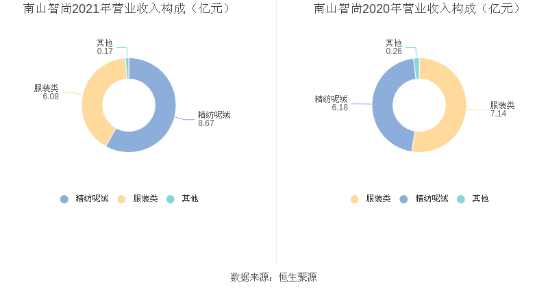 2021年度公司主营业务中,精纺呢绒收入8.67亿元,占营业收入的58.14%,同比增长40.34%;服装类收入6.08亿元,占营业收入的40.73%,同比下降14.84%;其他业务收入0.17亿元,占营业收入的1.12%,同比下降35.58%。