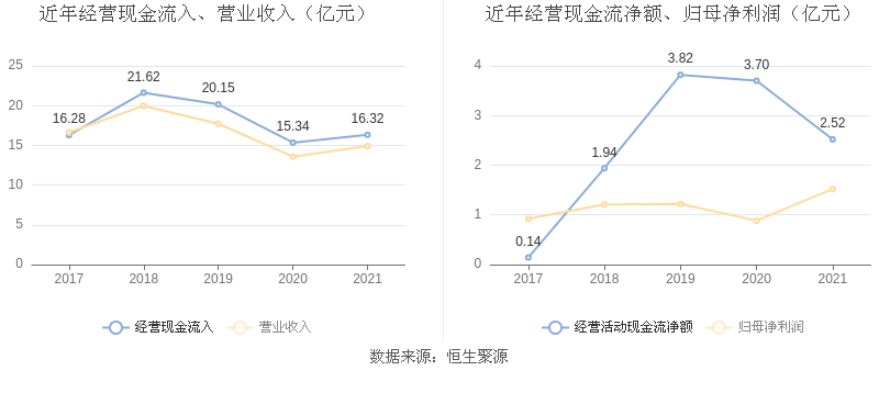 截至2021年末,公司经营活动现金流净额为2.52亿元,同比下降31.95%;筹资活动现金流净额3826.20万元,同比下降82.09%;投资活动现金流净额-3.46亿元,相比上年同期减少3.30亿元。