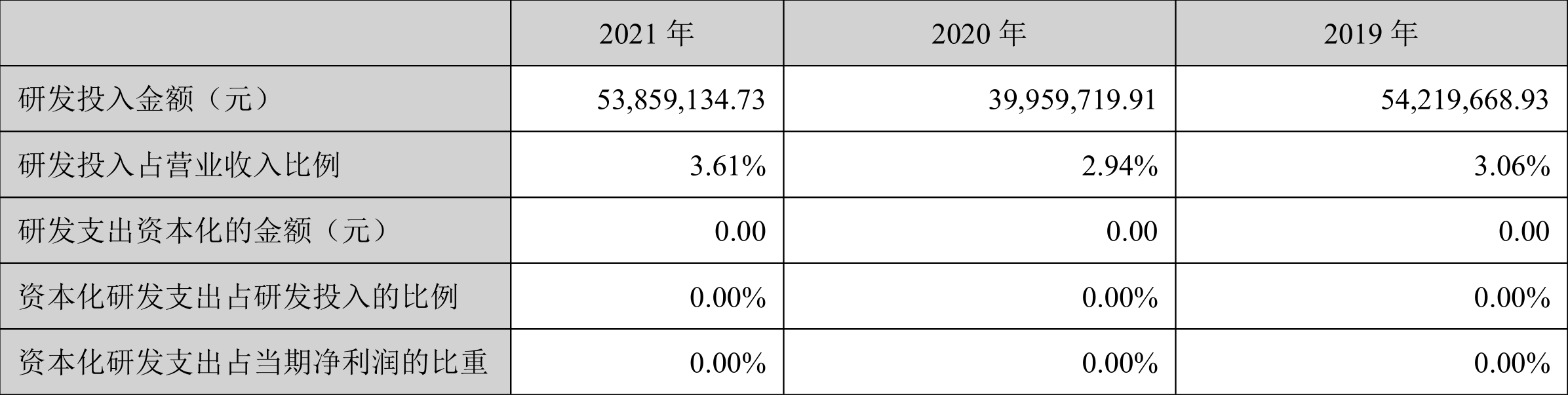 2021年全年,公司研发投入金额为5385.91万元,同比增长34.78%;研发投入占营业收入比例为3.61%,相比上年同期上升0.67个百分点。此外,公司全年研发投入资本化率为0。