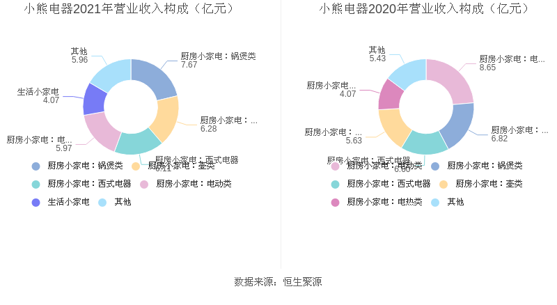 2021年度公司主营业务中,厨房小家电:锅煲类收入7.67亿元,占营业收入的21.28%,同比增长12.56%;厨房小家电:壶类收入6.28亿元,占营业收入的17.41%,同比增长11.50%;厨房小家电:西式电器收入6.11亿元,占营业收入的16.95%,同比增长1.81%。