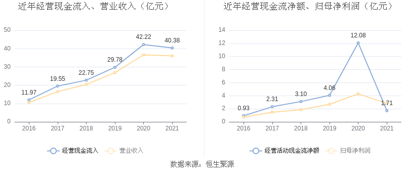 2021年,公司营业收入现金比为111.96%,净现比为60.39%。从近年数据来看,公司经营活动现金流入的增速与营业收入增速基本保持同步,净现比有所下降。