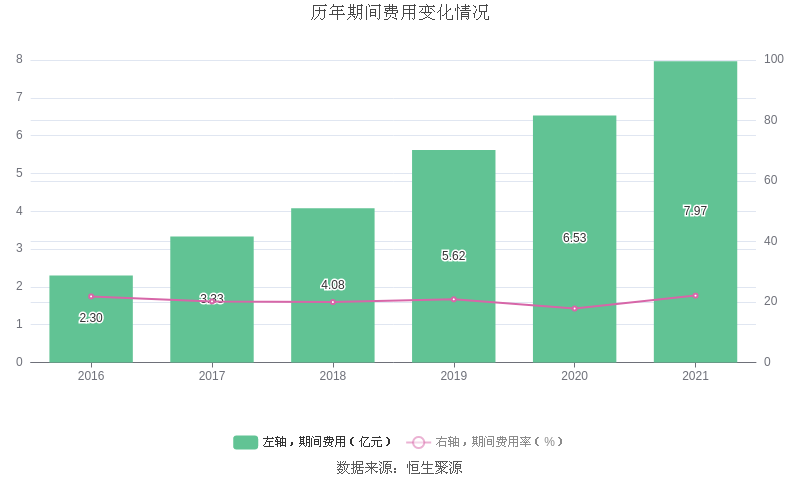 2021年全年,公司期间费用为7.97亿元,较上年增加1.45亿元;期间费用率为22.11%,较上年上升4.27个百分点。
