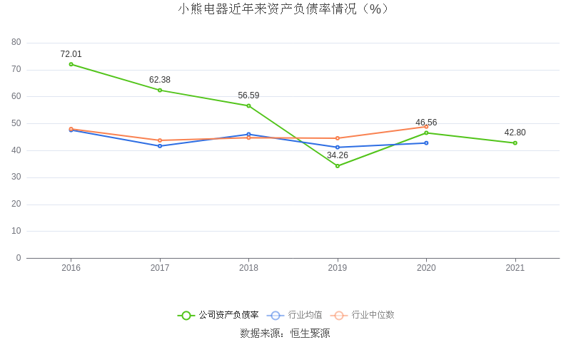 在偿债能力方面,公司2021年末资产负债率为42.80%,相比上年同期下降3.76个百分点,近年来整体高于行业均值。