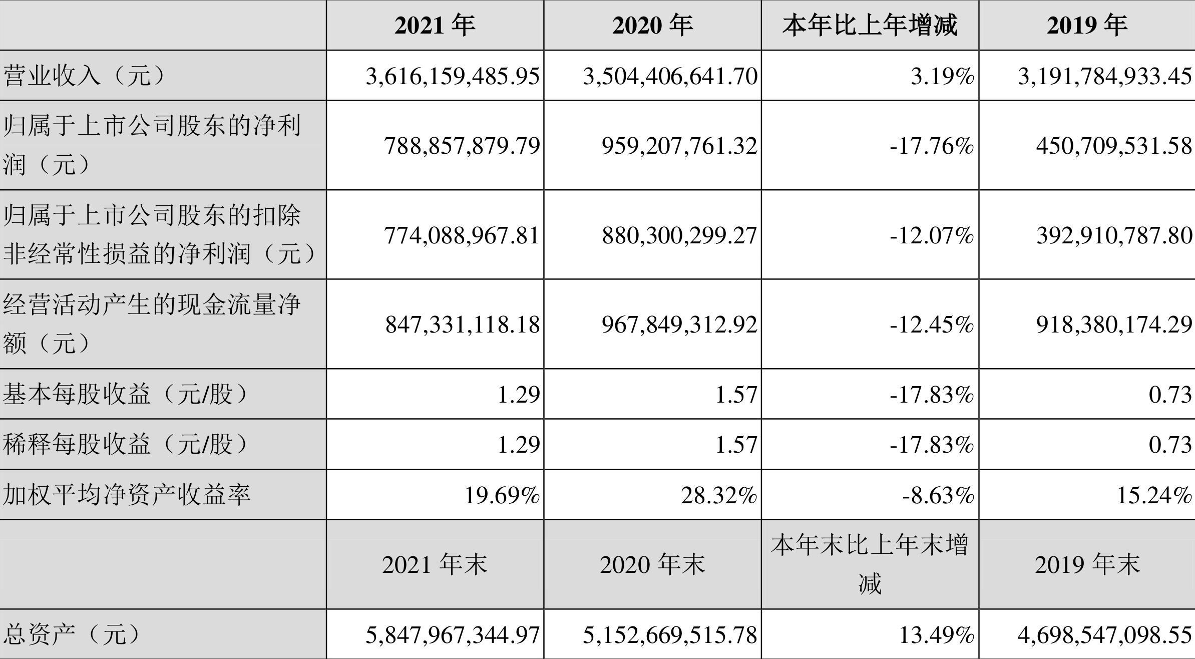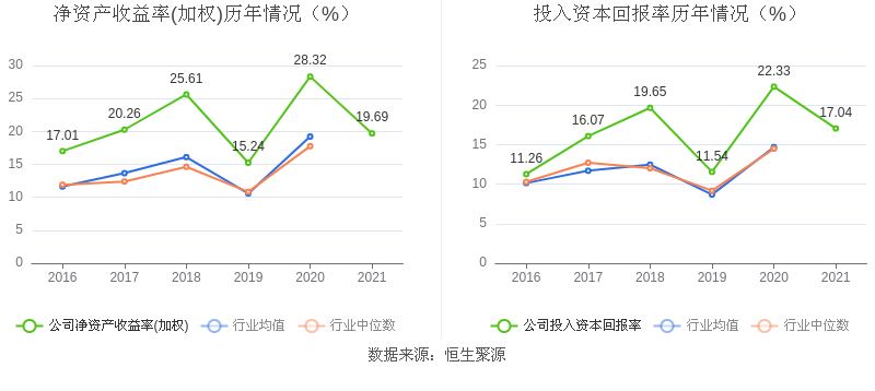 数据显示,2021年公司加权平均净资产收益率为19.69%,较上年同期下降8.63个百分点,长期高于行业平均;公司2021年投入资本回报率为17.04%,较上年同期下降5.29个百分点。