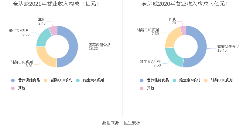 年报称,公司致力于服务大众营养健康,努力发展成为全球营养健康领域的先行者。2021年度公司主营业务中,营养保健食品收入18.22亿元,占营业收入的50.38%,同比下降1.26%;辅酶Q10系列收入8.91亿元,占营业收入的24.65%,同比增长20.54%;维生素A系列收入6.55亿元,占营业收入的18.10%,同比下降12.66%。