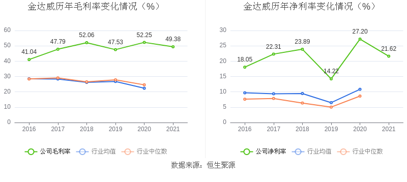 2021年,公司毛利率为49.38%,同比下降2.87个百分点;净利率为21.62%,较上年同期下降5.58个百分点。