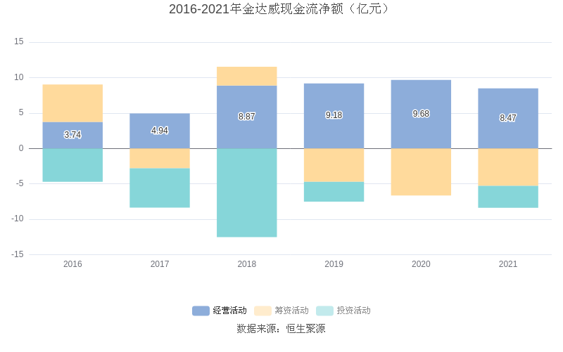 截至2021年末,公司经营活动现金流净额为8.47亿元,同比下降12.45%;筹资活动现金流净额-5.27亿元,同比增加1.37亿元;投资活动现金流净额-3.10亿元,相比上年同期减少3.10亿元。