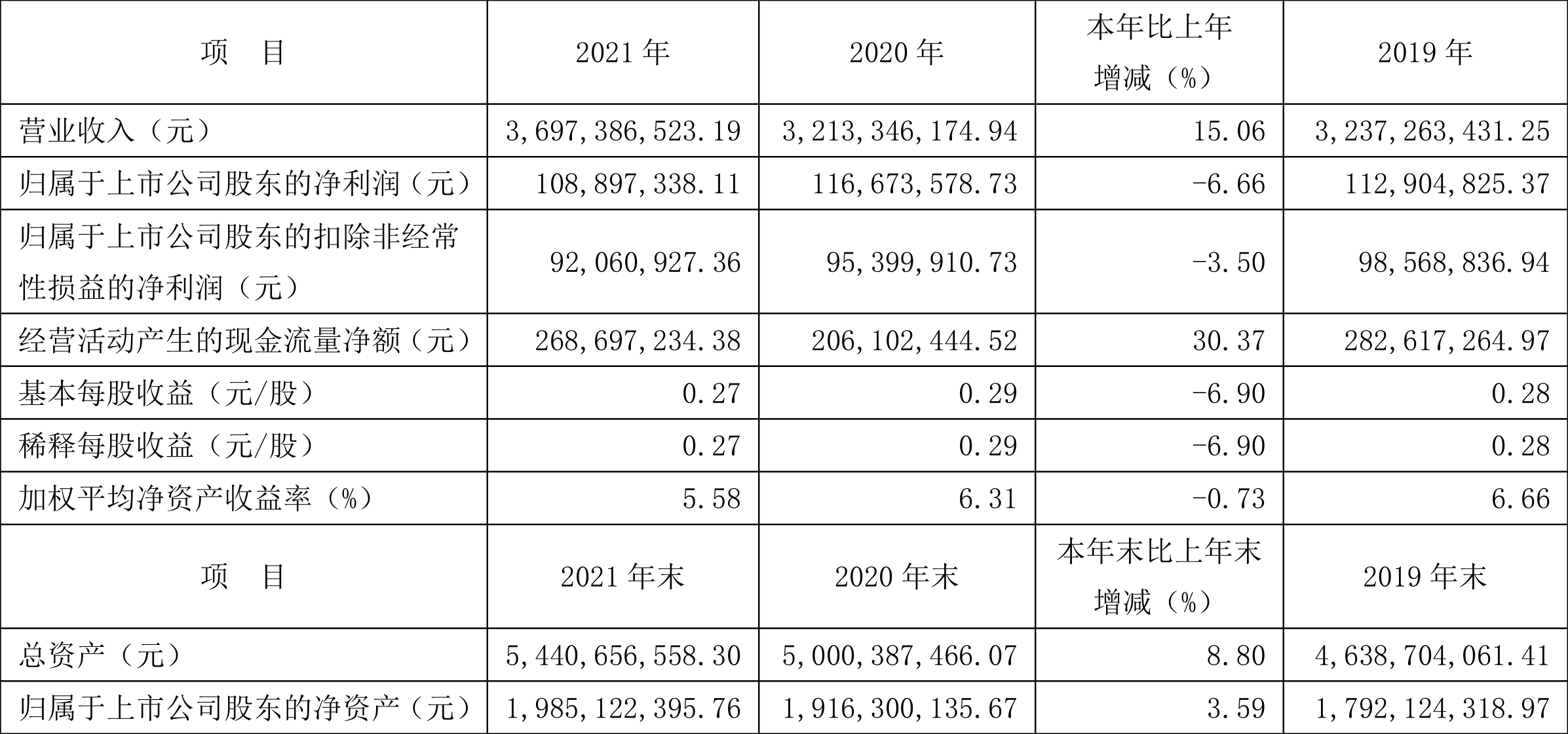中证财讯 创元科技(000551)4月12日披露2021年年度报告。2021年,公司实现营业收入36.97亿元,同比增长15.06%;归母净利润1.09亿元,同比下降6.67%;扣非净利润9206.09万元,同比下降3.50%;经营活动产生的现金流量净额为2.69亿元,同比增长30.37%;基本每股收益为0.27元,加权平均净资产收益率为5.58%。