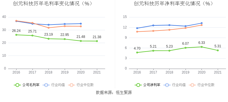 2021年,公司毛利率为21.38%,同比下降0.10个百分点;净利率为5.31%,较上年同期下降1.02个百分点。值得关注的是,近年来公司毛利率、净利率均长期低于行业平均水平。