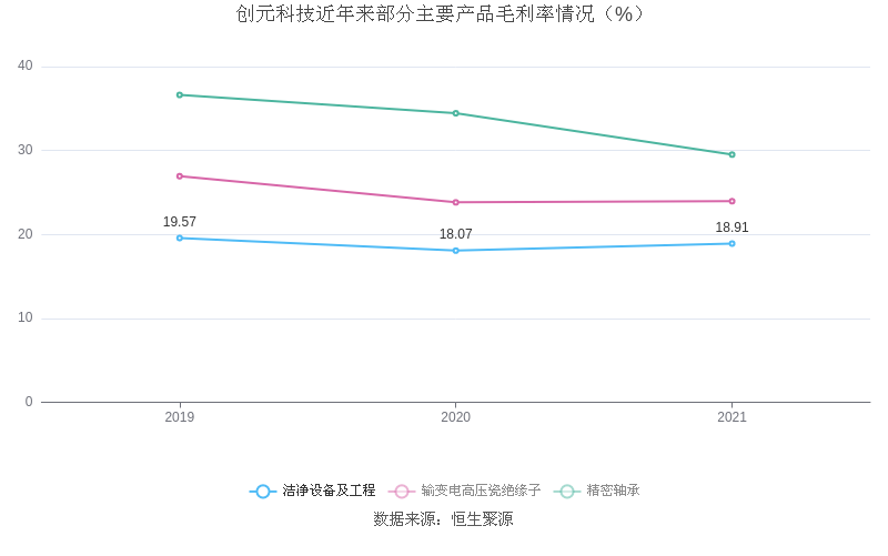 分产品看,洁净设备及工程、输变电高压瓷绝缘子、精密轴承2021年毛利率分别为18.91%、23.96%、29.51%。