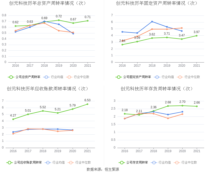 营运能力方面,2021年,公司总资产周转率为0.71次,上年同期为0.67次(2020年行业平均值为0.49次,公司位居同行业5/20);固定资产周转率为3.97次,上年同期为3.47次(2020年行业平均值为4.68次,公司位居同行业14/20);公司应收账款周转率、存货周转率分别6.53次、2.66次。